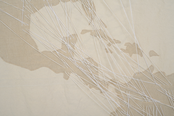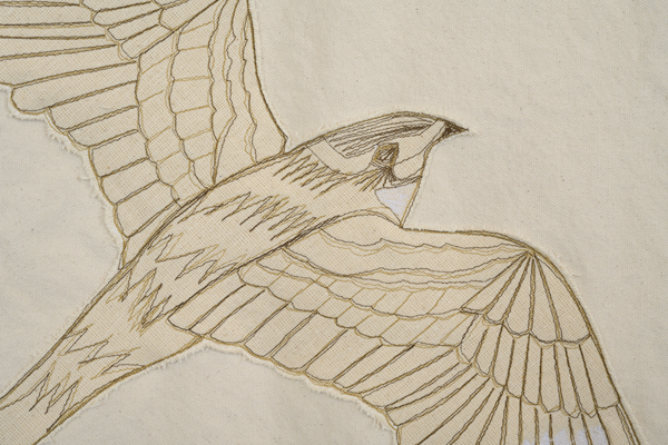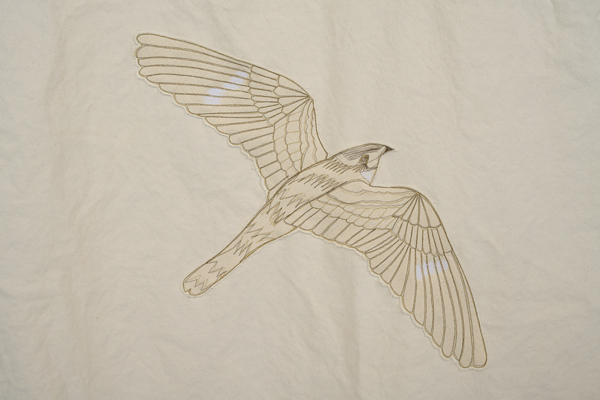 Migration is nature, and nature is borderless. In this piece, I have depicted the common nighthawk as a ghost bird to symbolize the decline of the species. Strings follow migration paths from North American breeding grounds to winter roosting spots in South America. Birds cross paths along the way, connecting to the land and to each other. I have left the strings loose at the end of the fall journeys to symbolize the uncertainties of return flight.